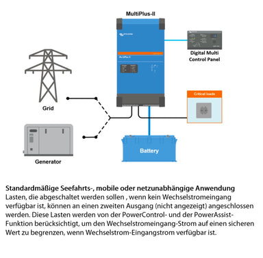 Il MultiPlus combina un inverter, un caricabatterie e un distributore di corrente alternata in un unico dispositivo, offrendo una soluzione versatile ed efficiente. A differenza degli inverter tradizionali, il MultiPlus offre una gestione energetica integrata e prestazioni più elevate.